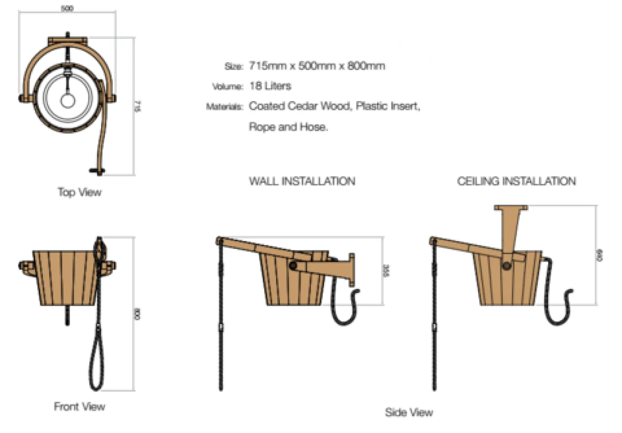 29 l vjedro, pribor uključen, napravljeno od drveta Kambale (Kambala drvo, koje još nazivaju i Iroko, otporno je na vodu i štetnike, a zbog svojih svojstava koristi se za proizvode i prostore s visokom vlagom, kao što su kupaonice i kuhinje.)